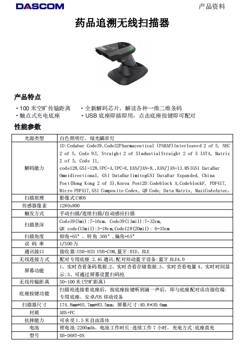 參數(shù) [品牌] 得實(shí) [型號] XB-D68T [毛重] 1KG [產(chǎn)地] 中國 [類型] 無線掃碼器 高拍儀 [單位] 臺 [材質(zhì)] 工程塑料